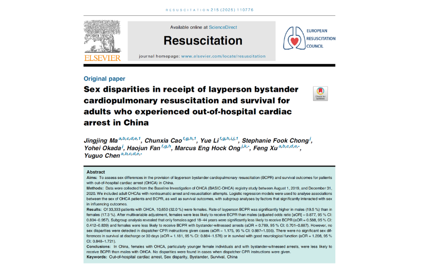 Recently, a research team led by Prof. Chen Yuguo and Prof. Xu Feng from the Department of Emergency Medicine of Qilu Hospital of Shandong University, the Ministry of Education Innovation Center for Basic Research on Critical and Severe Medicine, and the Shandong Provincial Clinical Research Center for Critical and Severe Medicine, published a study titled “Sex disparities in receipt of layperson bystander cardiopulmonary resuscitation and survival for adults who experienced out-of-hospital cardiac arrest in China” in Resuscitation, a leading international journal in emergency medicine (CAS Top Tier, Zone 1).